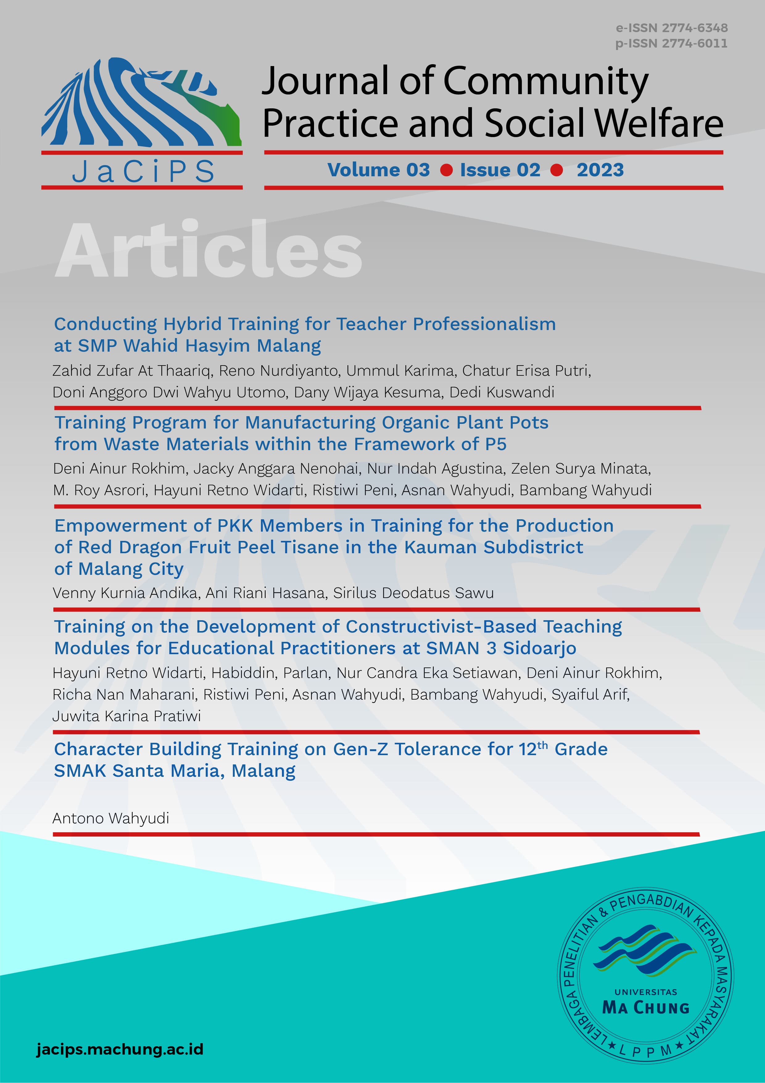 Vol. 3 No. 2 (2023)The Journal of Community Practice and Social Welfare (JaCiPS) is approaching human welfare through applied technology in complex society and community. Apply the unlimited knowledge and interdisciplinary, including: